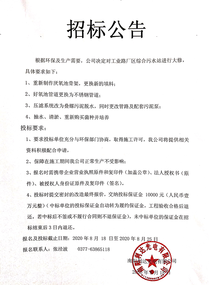廠區(qū)綜合污水站大修招標公告