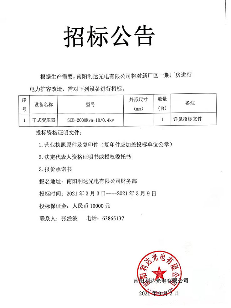 干式變壓器采購招標公告